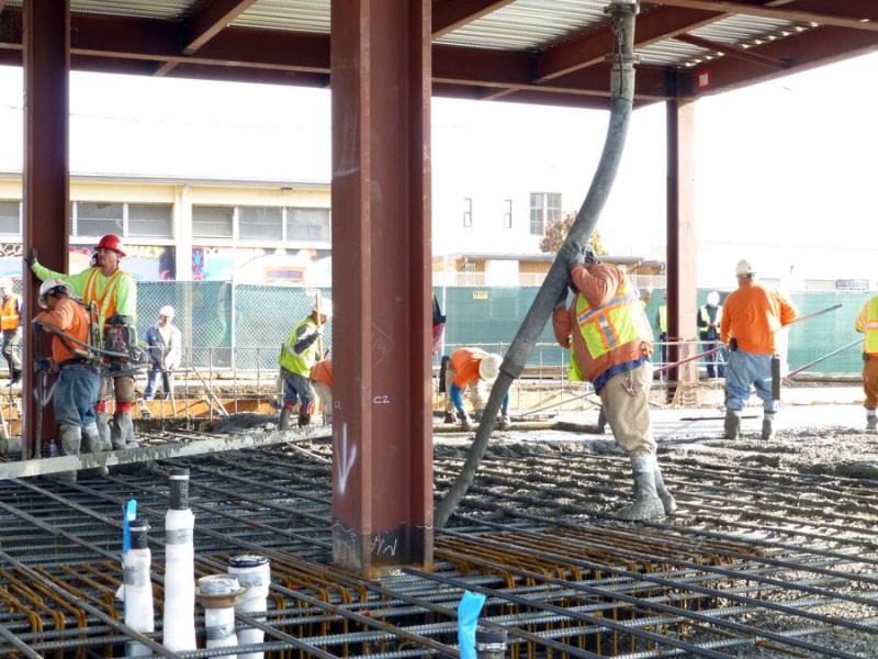 This was a seismic upgrade of a two-story concrete-frame building with concrete infill shear walls