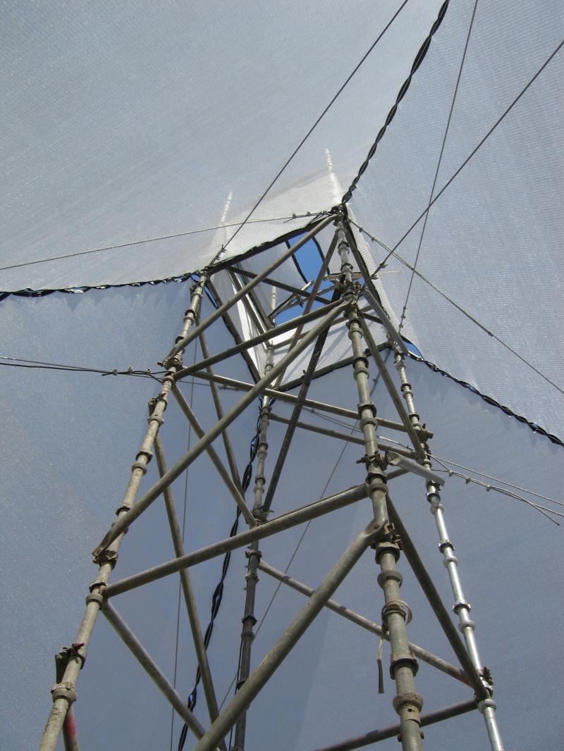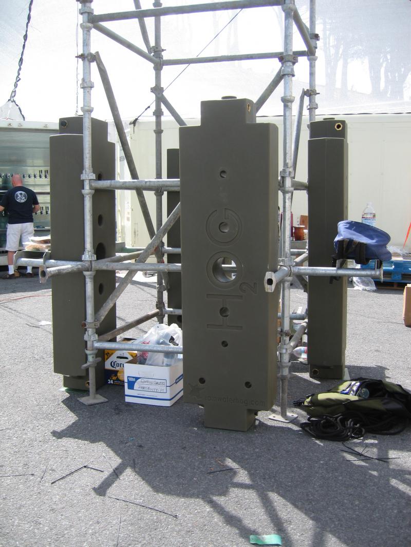 The central tower utilized prefabricated scaffolding tubes and clamps for ease and speed of construction. The base of the tower was anchored with four “Waterhog” tanks to prevent any lateral movement at the base caused by accidental impact load. In addition, the tanks acted as counterweights against any uplift wind load.