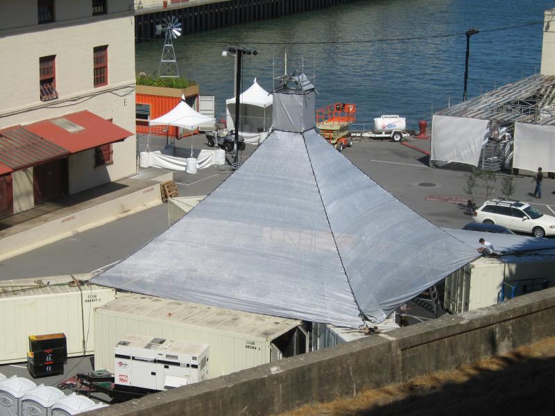 1/2” diameter cables were used to brace the tower as well as provide attachment points for the perforated aluminum fabric. The cables were attached to refrigerated containers on the four corners of the pyramid. The containers served as anchors for the tent structure as well as storage for the variety of beers to be served at the festival.