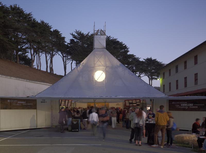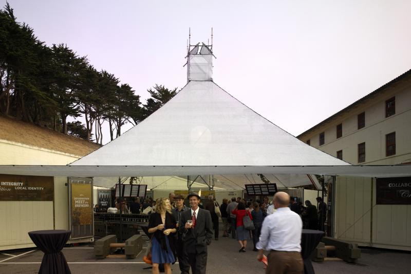SMW & Associates collaborated with designer John Randolph in the design of the Beer Pavilion for the Slow Food Nation 2008 event held in San Francisco. The Beer Pavilion was one of the two freestanding outdoor pavilions erected at the Fort Mason site. The pavilion took on the shape of a hop kiln measuring 35 square feet by 36 feet tall. It was designed as a tent structure with a central tower and cable guide wires supporting a fabric skin.